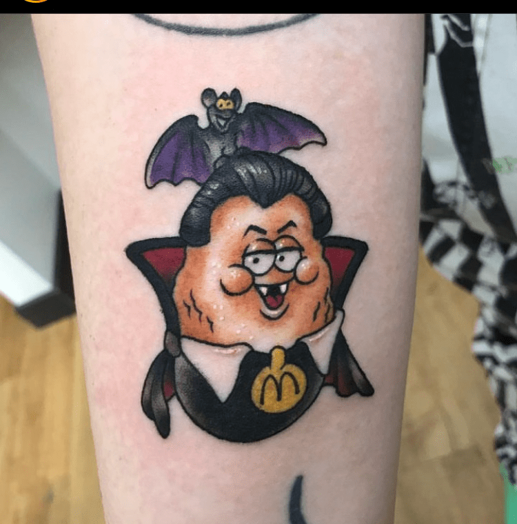 Count McNugget, along with Count Chocula, Garfield and Odie, and The Witch all represent my family heirloom, the circa 1985 CBS Halloween Lineup recorded on VHS. This special has the original commercials for the Counts as well as Garfield’s Halloween Adventure and Witch’s Night Out specials. My right arm is basically a tribute to Halloween/all things spooky, and I’m happy to have all of these tattoos in the mix.