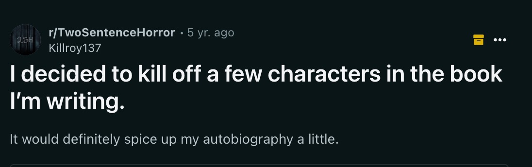 Two-Sentence Horror Stories are fascinating to me. I really enjoy the TV series, and I also enjoy the subreddit.